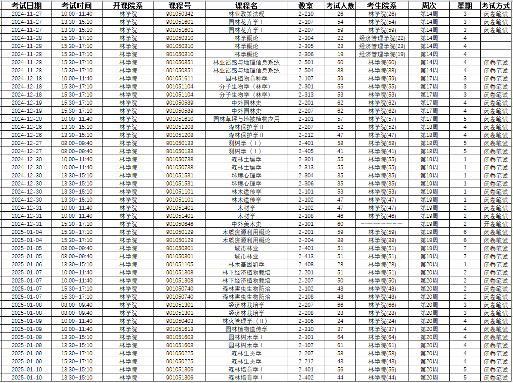 2024-2025学年秋季学期考表安排