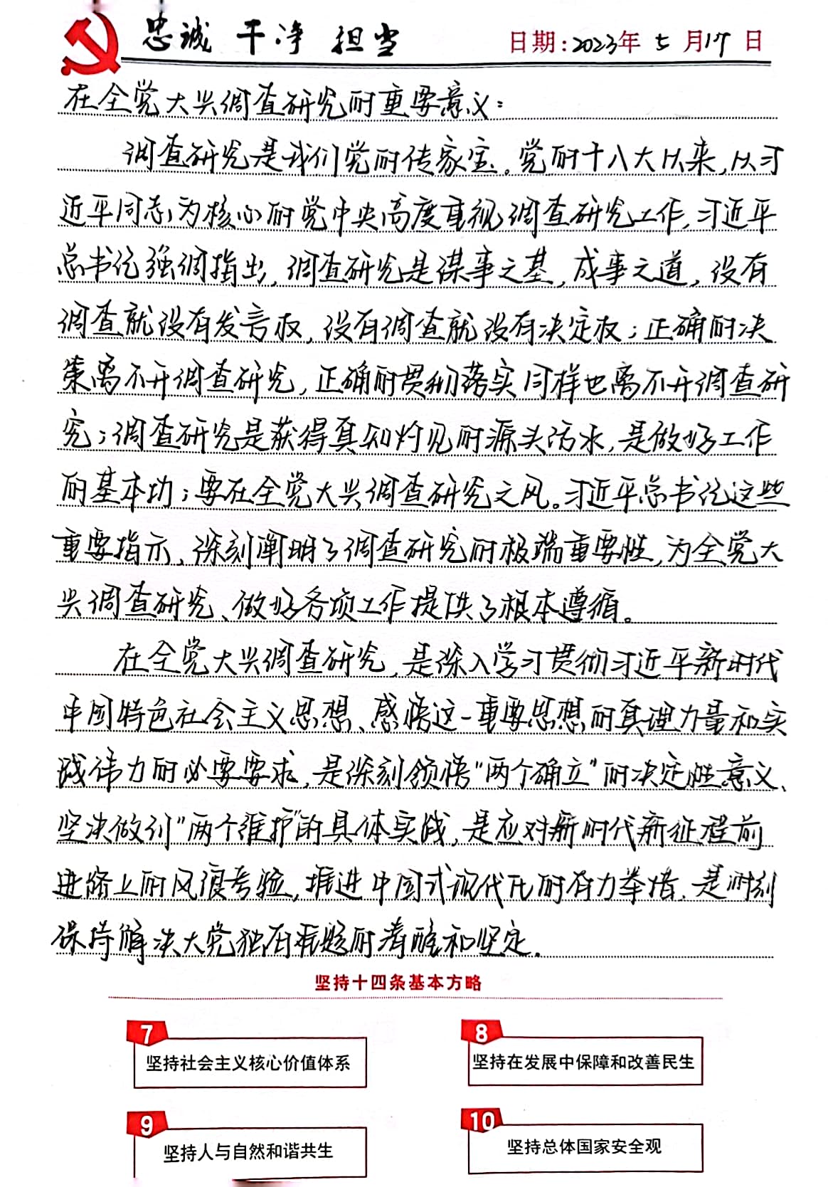 通过这一周的学习,我明确了在全党大兴调查的意义与总体要求。作为一名学生党员,我们在科研任务中也要做好调查研究,做好工作的基本功,在科研任务中也要严谨认真,做好前期工作才能作出正确的决策,为科研任务研究打下良好基础。